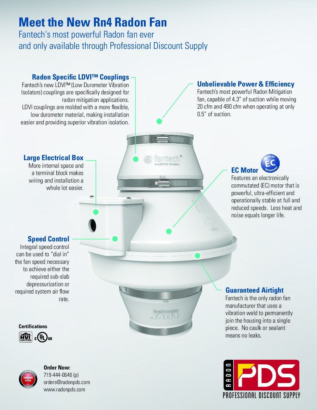 The Rn4-3EC is Fantech’s newest, most-powerful fan in their family of Radon Mitigation fans. PDS engineers aided Fantech in testing and design of this new radon fan. Comes with 3″ pipe fittings