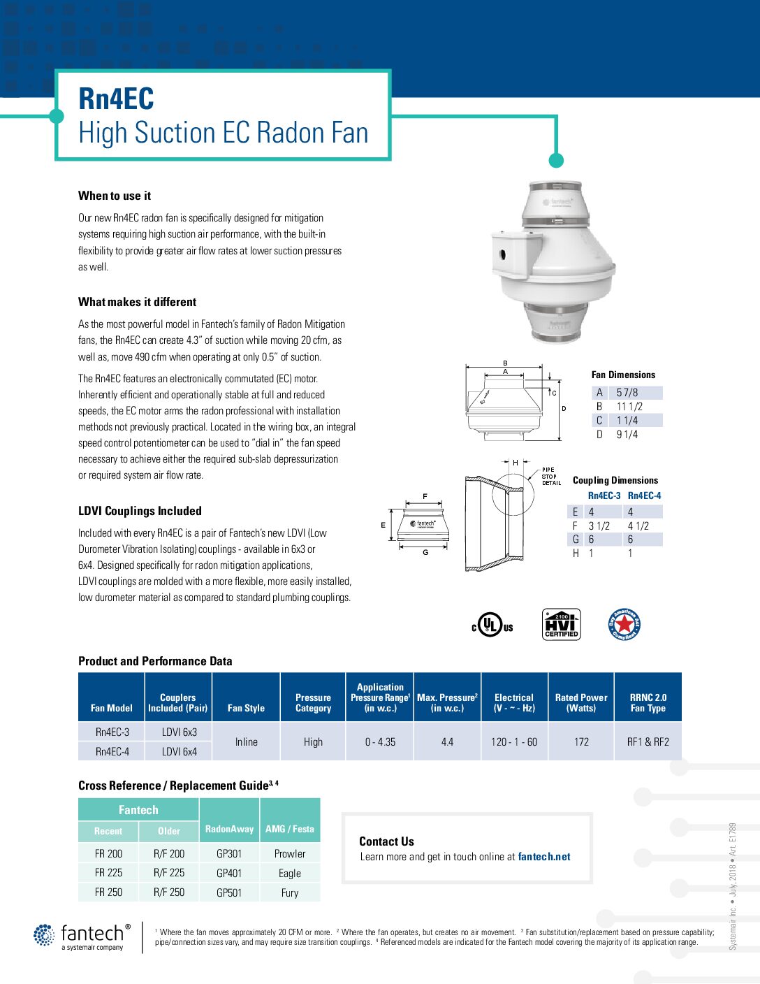 Included with every Rn4EC is a pair of Fantech’s new LDVI (Low Durometer Vibration Isolators) couplings. Designed specifically for radon mitigation applications, LDVI couplings are molded with a more flexible, low durometer material as compared to standard plumbing couplings. the more flexible LDVI couplings make installation easier and provide superior vibration isolation. This model comes with 6″ to 3″ pipe couplings. Compare to the Festa Eagle Extreme or the RadonAway Gx5a