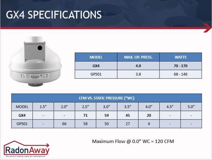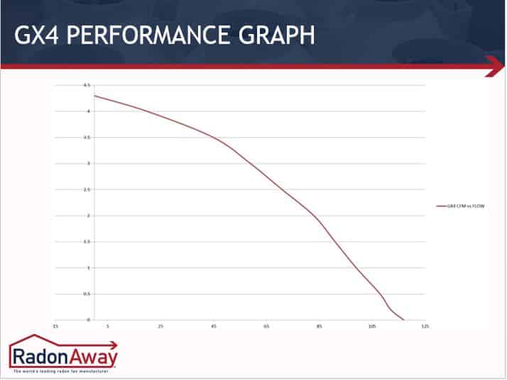 The RadonAway GX4 brings sleek lines and high performance to high suction fans. Quieter than previous high suction fans we’ve tested, the GX4 has more suction than nearly every fan in our line. See the performance curves below. This fan fits a real need between mid range and the highest suction fans on market. With the reliable RadonAway name and their incredible ProSeries EverWhite housing, you get high suction in a great looking package.